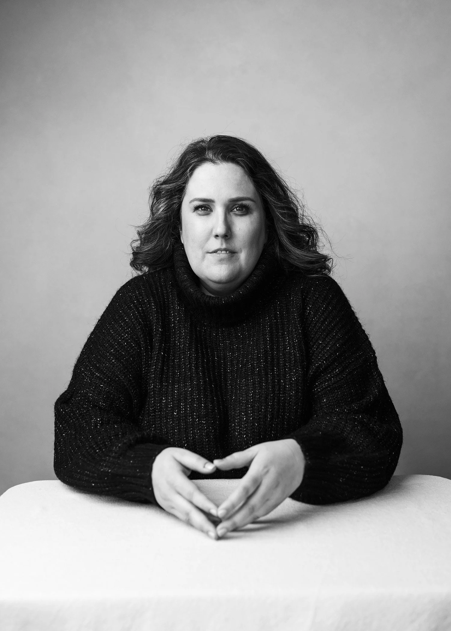 Visual Description (for accessibility statements): A woman with shoulder-length wavy hair sits at a table facing the camera. She wears a textured black turtleneck. Her hands rest gently in front of her. She has light skin, expressive eyes, and a quiet, steady expression. The background is soft gray with even lighting.